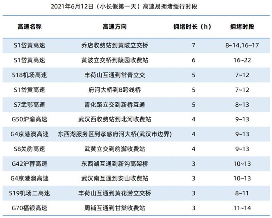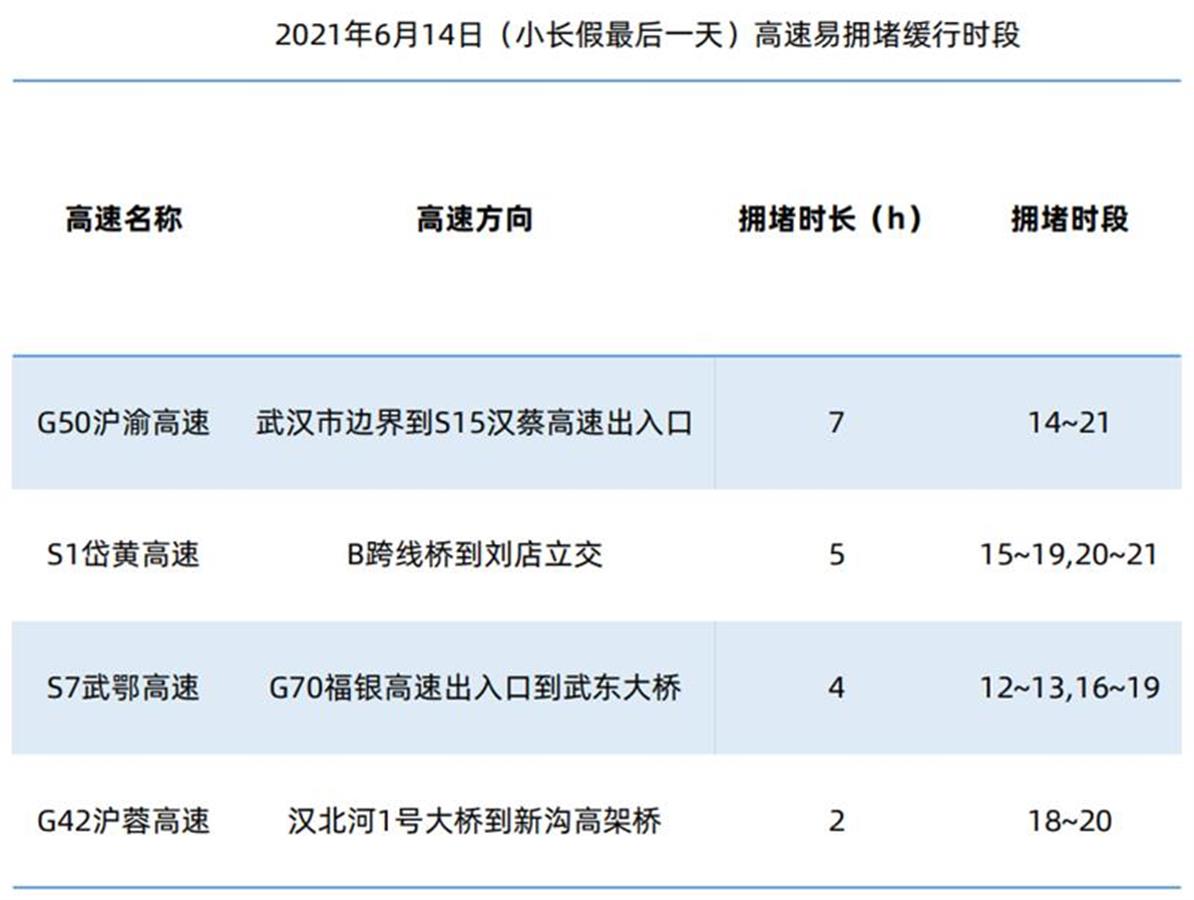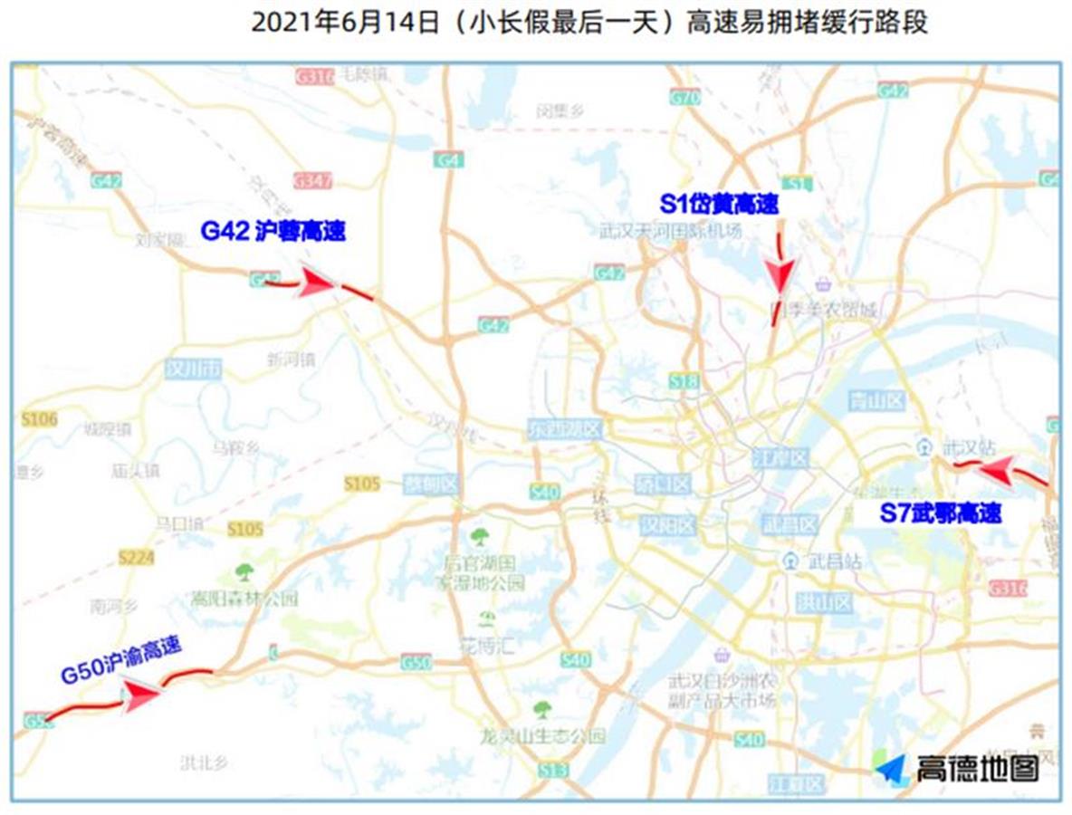 返程(6月14日)易擁堵緩行的高速有G50滬渝高速、S1岱黃高速、S7武鄂高速等高速的部分路段。