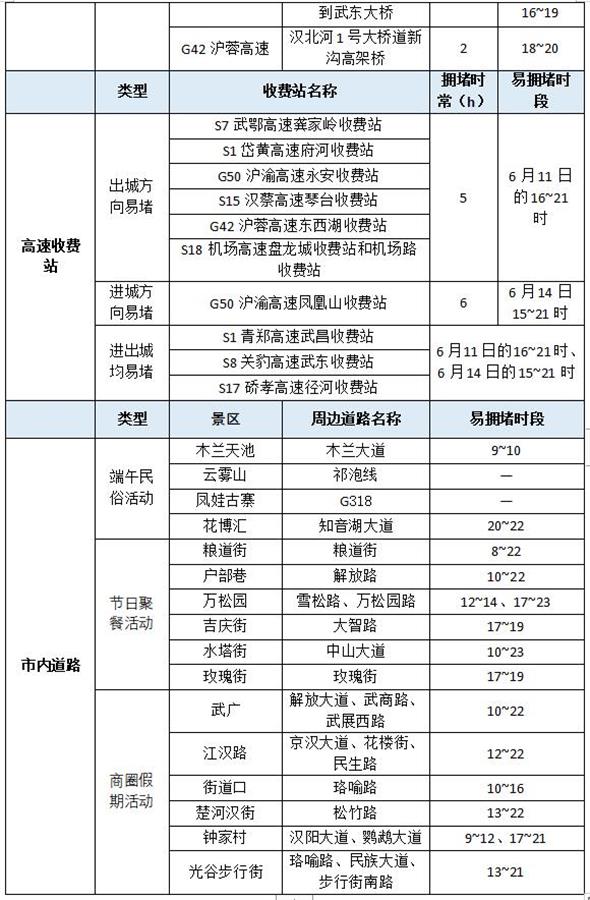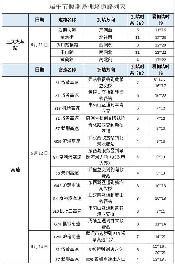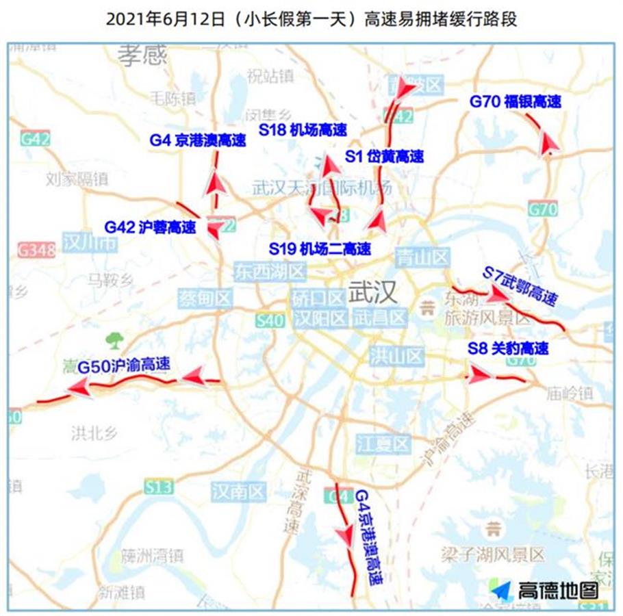 高速公路:根據預測,端午期間武漢市出程(6月12日)易擁堵緩行的高速主要是S1岱黃高速、S18機場高速、S7武鄂高速、G50滬渝高速等高速的部分路段。