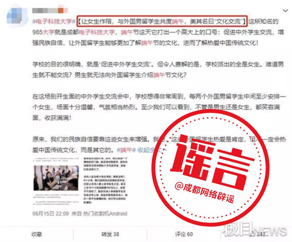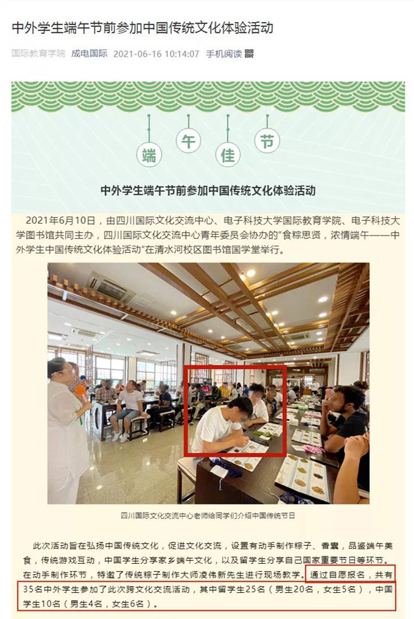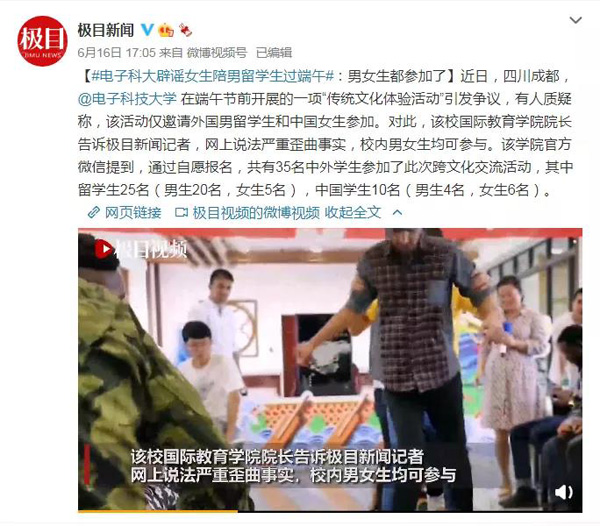 近日,電子科技大學在端午節前開展的一項“傳統文化體驗活動”引發輿論爭議。有網友及自媒體發布圖文稱,該校僅邀請外國男留學生和中國女生參加“端午聯誼會”,看不到中國男生的身影,質疑校方做法不妥、崇洋媚外。還有博主聲稱,“讓女生作陪,與外國男留學生共度端午,美其名曰‘文化交流’。”