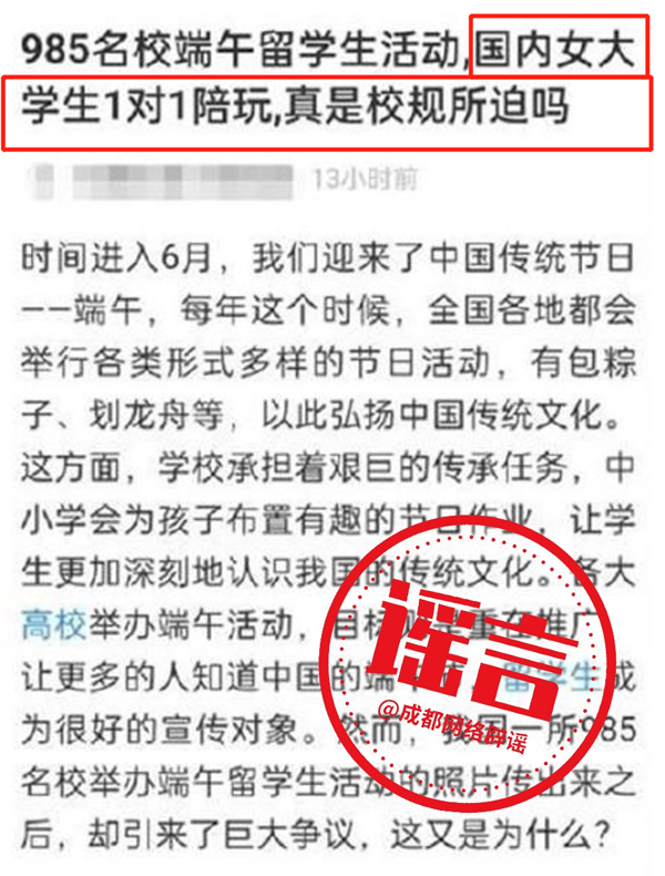 經成都網絡辟謠平臺搜索發現,該學院官方微信公眾號“成電國際”于2021年6月16日發布該活動報道,文中提到:通過自愿報名,共有35名中外學生參加了此次跨文化交流活動,其中留學生25名(男生20名,女生5名),中國學生10名(男生4名,女生6名)。此外,從該文配發的圖片中看到,現場有幾名中國男生參與此次活動,并不存在網傳的“強制”、“一對一”、“無一男生參加”等情況。