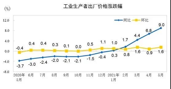 國家統計局數據顯示,5月份CPI上漲1.3%,漲幅比上月擴大0.4個百分點;國際原油、鐵礦石、有色金屬等大宗商品價格大幅上漲,全國工業生產者出廠價格同比上漲9.0%,創出近13年新高。這也引起大家對于PPI漲幅向CPI傳導的擔憂。