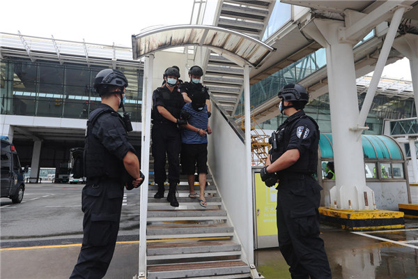圖為犯罪嫌疑人潘某被特警押解下飛機。應后威 攝
