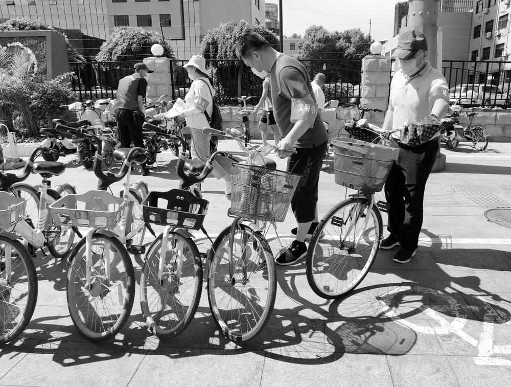 市環境衛生事務中心的工作人員整理亂停亂放的非機動車。記者 李青 攝