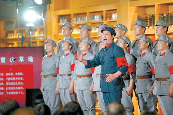 “橫斷山,路難行,天如火來水似銀……”昨天下午,國家大劇院藝術(shù)資料中心里,身穿紅軍軍裝的武警北京總隊(duì)?wèi)?zhàn)士男聲合唱團(tuán),用一首《四渡赤水出奇兵》把觀眾帶往了兩萬五千里的英雄征程。