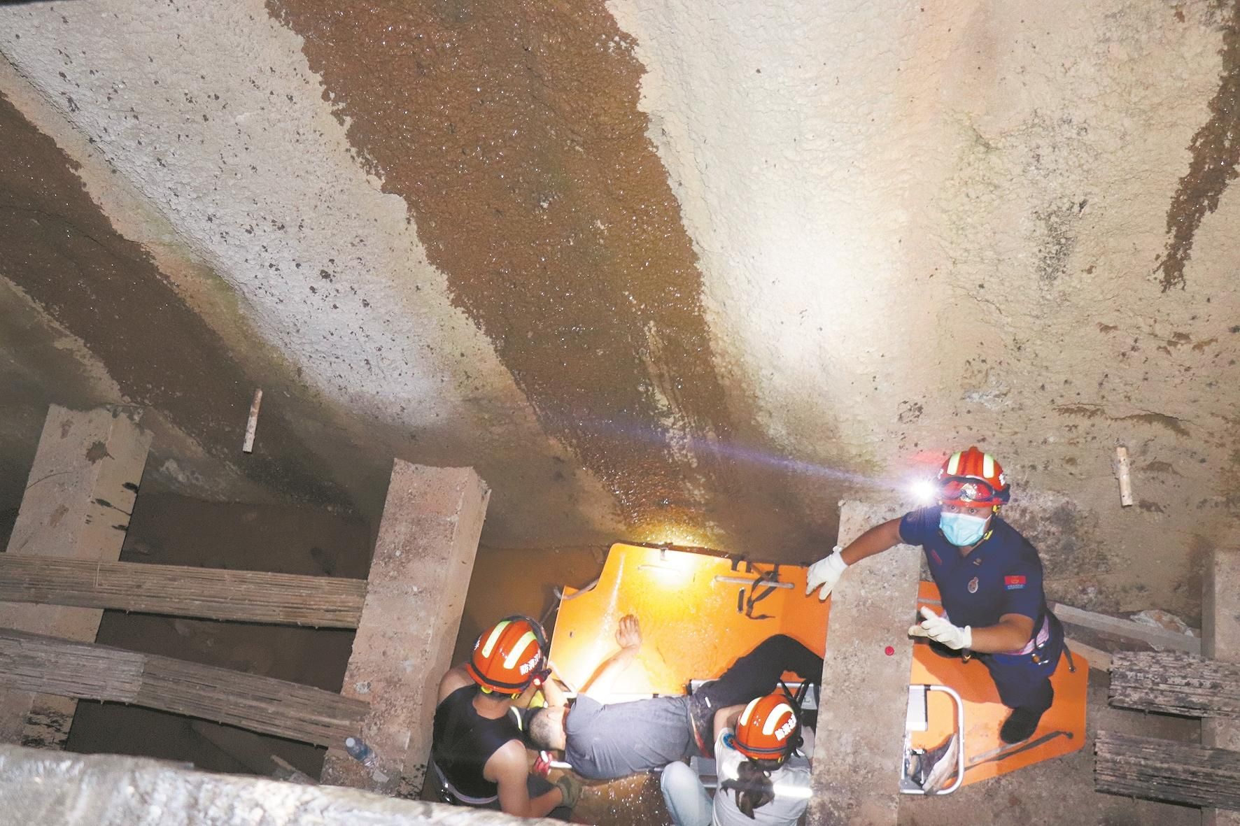 在確保井下環境安全的情況下,三名消防員攜帶救援繩索、多功能擔架下到被困地點,初步處理被困人員傷情,同時對其進行心理安撫,緩解其緊張情緒。地面消防員利用滑輪、繩索等器材,配合井下消防員展開營救,將被困人員抬上多功能擔架,合力將其沿井壁救出。