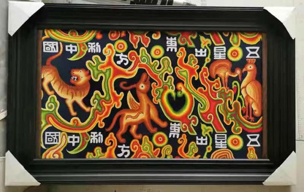 大家請看大屏幕,屏幕上這幅《五星出東方》是我繡的,我們還有很多刺繡作品,背包、靠枕,大家看我繡得漂不漂亮?顏色搭配好不好看?