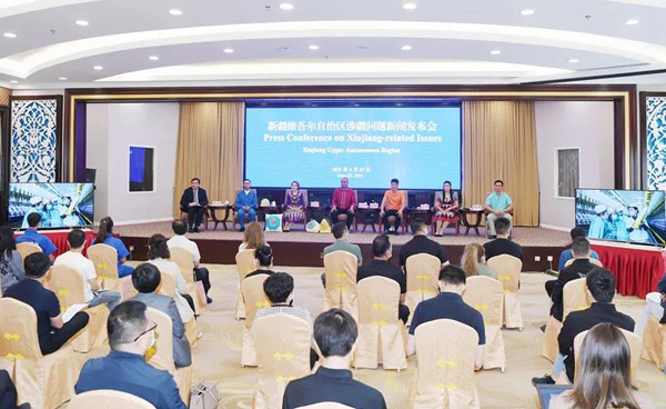2021年6月23日,新疆維吾爾自治區(qū)在疆舉辦專場涉疆問題新聞發(fā)布會,邀請了喀什、和田、阿克蘇地區(qū)和巴音郭楞蒙古自治州等地的六位少數(shù)民族群眾代表,分享自己的工作生活,以真實的經(jīng)歷駁斥“強迫勞動”、抹黑新疆人權狀況等涉疆謊言。