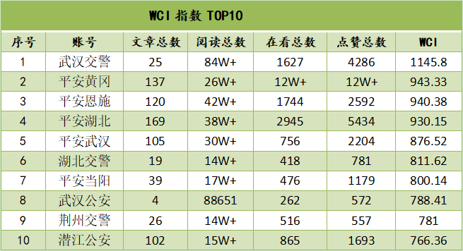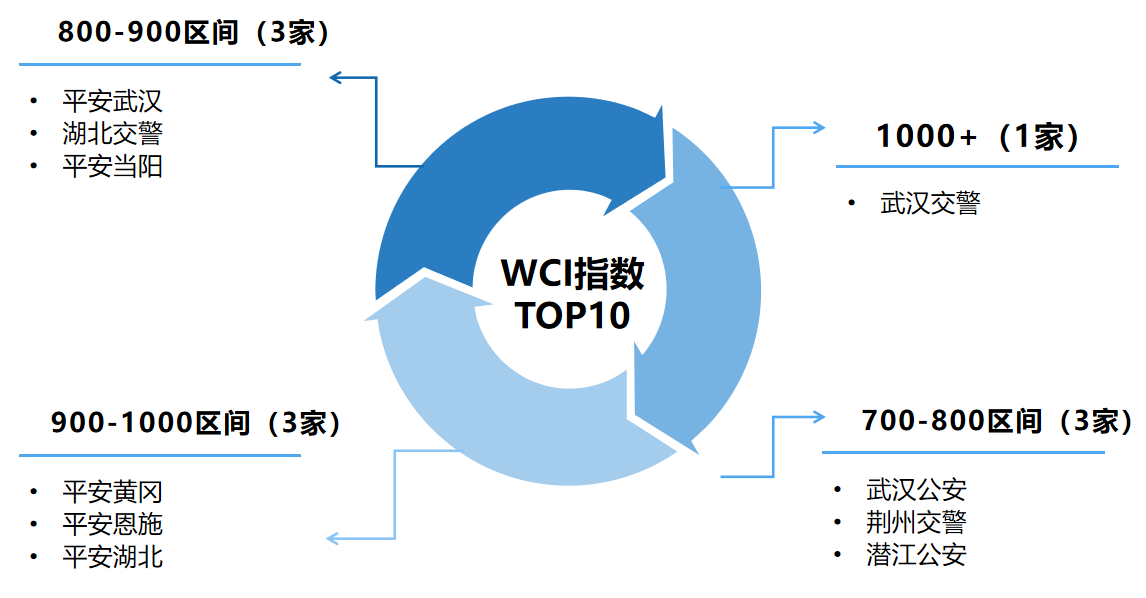 從榜單排名來看,“武漢交警”“平安黃岡”WCI指數(shù)穩(wěn)定保持在前二名,“平安恩施”“平安湖北”“平安武漢”三個單位5月綜合表現(xiàn)優(yōu)秀。此外,還有兩家單位本月表現(xiàn)也較為優(yōu)秀,其中,“平安恩施”今年首次沖入前三甲,“潛江公安”今年首次沖入前十名。