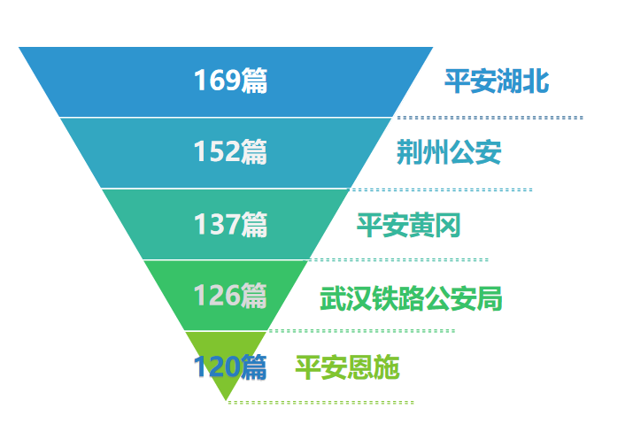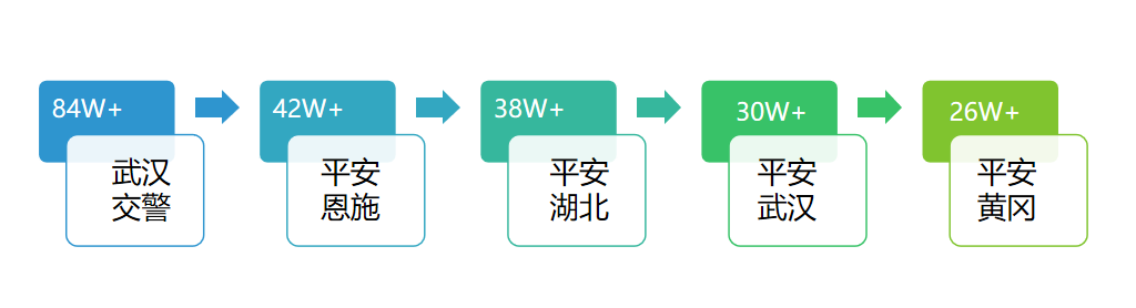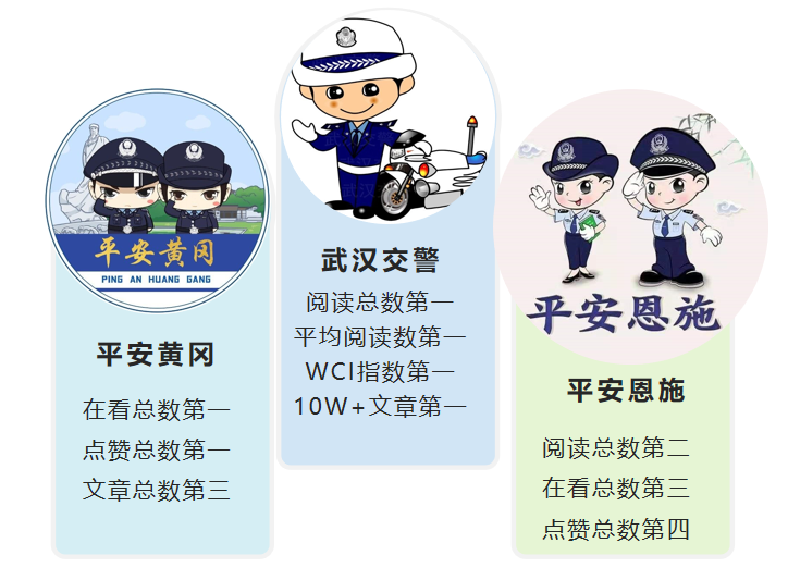 本期榜單前三甲分別為“武漢交警”“平安黃岡”和“平安恩施”。其中“武漢交警”“平安黃岡”連續(xù)七個月蟬聯(lián)榜單冠亞軍,“武漢交警”憑借5篇10萬+文章連續(xù)10個月蟬聯(lián)榜首位置;“平安黃岡”近半年時間長期穩(wěn)居亞軍,文章總數(shù)、在看總數(shù)、點贊總數(shù)等單項指標(biāo)表現(xiàn)十分亮眼;“平安恩施”則首次奪得榜單季軍。