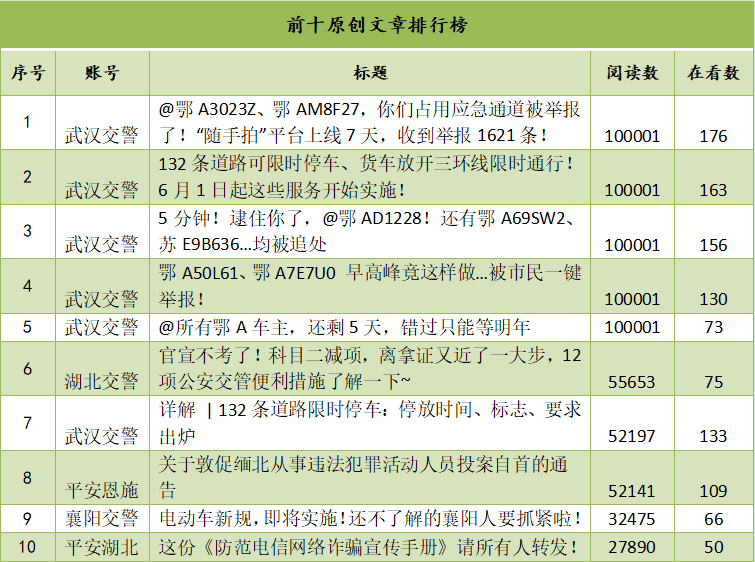總體來看,2021年5月份湖北公安行業(yè)原創(chuàng)文章閱讀量前十排行中有8篇屬于“交警”系微信號。其中,“武漢交警”5篇文章閱讀數(shù)均突破10萬+,表現(xiàn)依舊搶眼。此外,“平安恩施”“平安湖北”各攜1篇文章上榜。在具體內(nèi)容上,入榜公眾號話題涉及面較廣,包括違法舉報、限時停車、電信詐騙自首通告、電動車新規(guī)等方面。其中,“武漢交警”發(fā)布的《你們占用應(yīng)急通道被舉報了!“隨手拍”平臺上線7天,收到舉報1621條!》《早高峰竟這樣做…被市民一鍵舉報!》等2篇文章,內(nèi)容均涉及一鍵違法舉報,與廣大車主日常駕車習(xí)慣密切相關(guān),故能引發(fā)較高關(guān)注。此外,“武漢交警”發(fā)布的《科目二減項,離拿證又近了一大步,12項公安交管便利措施了解一下》《132條道路限時停車:停放時間、標(biāo)志、要求出爐》,以及“平安恩施”發(fā)布的《關(guān)于敦促緬北從事違法犯罪活動人員投案自首的通告》等三篇文章,也都有較高關(guān)注度。