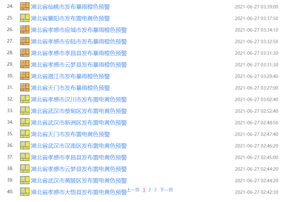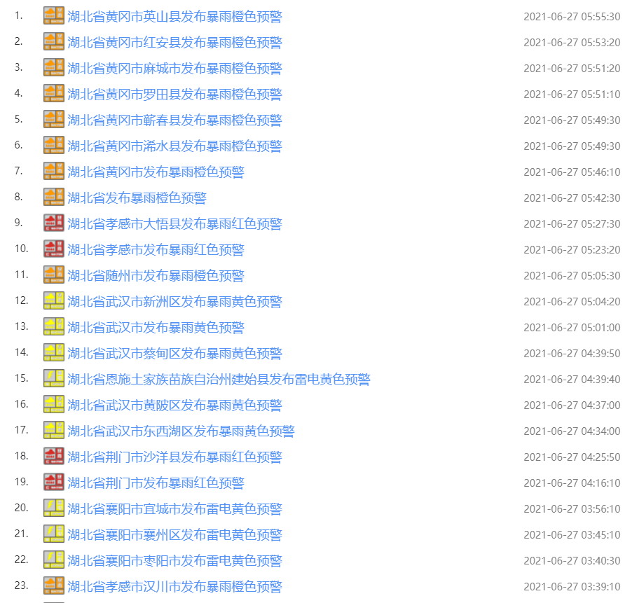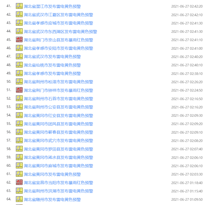 武漢市氣象臺2021年06月27日05時00分發布暴雨黃色預警信號:預計未來6小時,新洲將有50毫米以上降水,并伴有雷電、陣風6-8級,城鄉漬澇、地質災害、中小河流洪水氣象風險較高,請注意防范。(預警信息來源:國家預警信息發布中心)