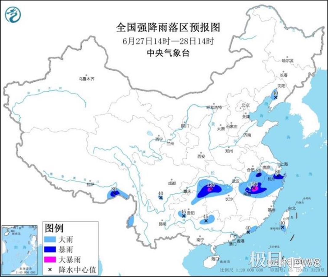 中央氣象臺今日上午10時繼續(xù)發(fā)布暴雨藍色預警:預計,27日14時至28日14時,安徽南部、江西北部、浙江大部、湖北南部、湖南北部、重慶東南部、貴州東北部和西南部、廣西北部、廣東東南部以及遼寧中部、西藏東南部、四川南部、云南西部、臺灣島西南部等地部分地區(qū)有大到暴雨,其中,江西北部、湖南西北部等地局地有大暴雨(100-150毫米)。上述部分地區(qū)伴有短時強降水(最大小時降雨量30-50毫米,局地可超過70毫米),局地有雷暴大風等強對流天氣。