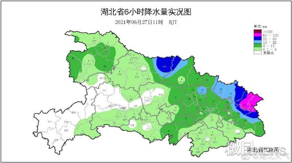 今天上午,雨量最大的是羅田,5時至11時,羅田降雨量已超過了100毫米,6個小時就完成了大暴雨的量級。