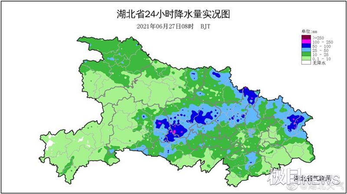 來自氣象部門的降水實況顯示:昨天新一輪強降水登陸湖北,截至今天上午8時,大到暴雨主要出現(xiàn)在宜昌東部、荊州北部、荊門、孝感北部、武漢北部、黃岡北部、隨州北部、咸寧局部。其中有15個鄉(xiāng)鎮(zhèn)站點出現(xiàn)超過100毫米的大暴雨,比如,當陽、夷陵就出現(xiàn)暴雨到大暴雨,最大雨量出現(xiàn)在荊門南部的十里鋪,24小時雨量達207毫米。