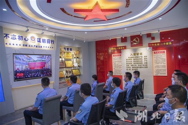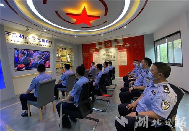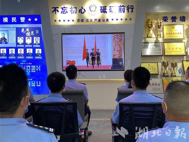 6月29日,武漢市公安局東西湖分局黨員文化活動(dòng)中心,沒有執(zhí)勤任務(wù)的民警、輔警集中收看“七一勛章”頒授儀式直播。通過收看頒授儀式,賡續(xù)紅色血脈,傳承理想信念。