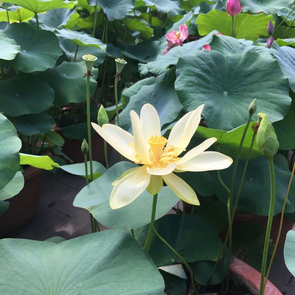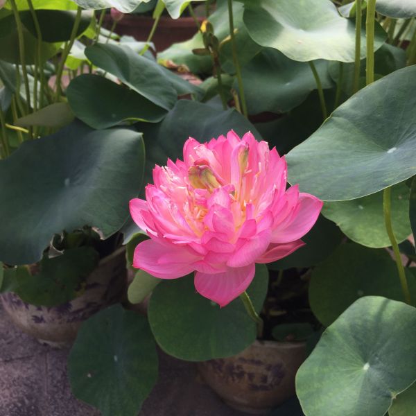 作為園林科研院所,園科院舉辦的荷花展不僅有顏值,還科技含量十足。記者了解到,經過多年的荷花資源收集和品種培育,園科院目前共有近500種荷花品種。該院荷花專家潘宜平挑選出了100種花多、色艷的荷花精品展出。其中不僅有“紅燈高照”“大灑錦”“小舞妃”“黃蓮花”“紅領巾”等傳統知名品種;還有他們自己培育,并成功完成國際品種登陸的“紅顏滴翠”“佛手觀音”“古浪小紅”“霓裳曲”等?!凹t顏滴翠”還多次獲得國際荷展碗培技術競賽一等獎和金獎。