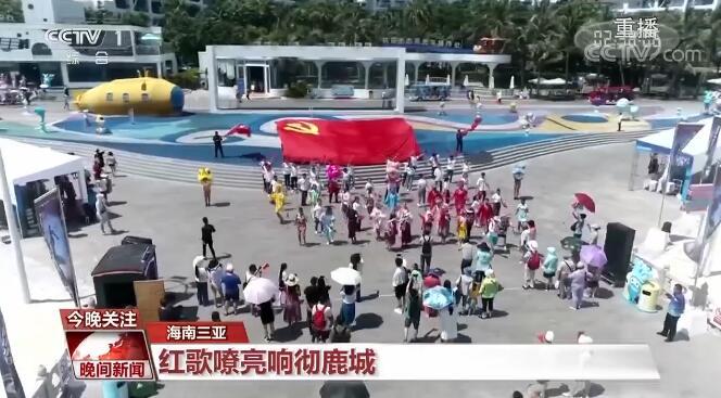 在海南三亞蜈支洲島景區,“永遠跟黨走”快閃活動,讓游客深受感染并參與其中。眾人高唱《唱支山歌給黨聽》,并撐起巨幅黨旗迎風舞動。