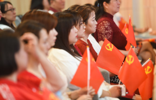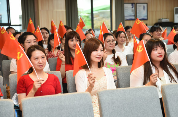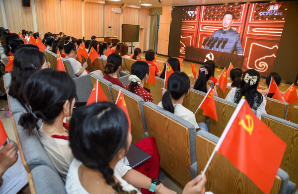 清晨7時30分,老師們身著紅色或白色正裝,拿著鮮艷的黨旗,齊聚學校報告廳,收看現(xiàn)場直播。當國旗在天安門廣場冉冉升起,老師們肅立,齊唱國歌。“這一刻,我們熱血沸騰,作為一名中國人,作為一名人民教師,此時此刻,我感到無上光榮。”該校教師馬琪琪說。