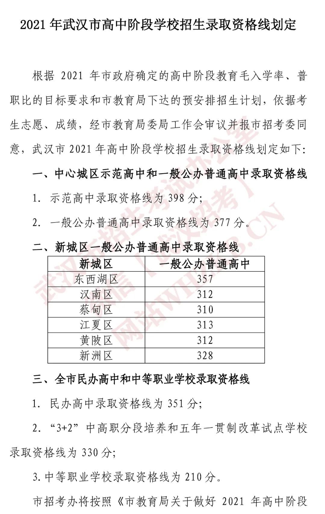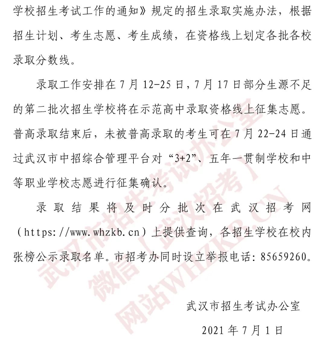 長江日報7月1日訊  剛剛,武漢市招生考試辦公室發布了“2021年武漢市高中階段學校招生錄取資格線劃定”公告,具體如下: