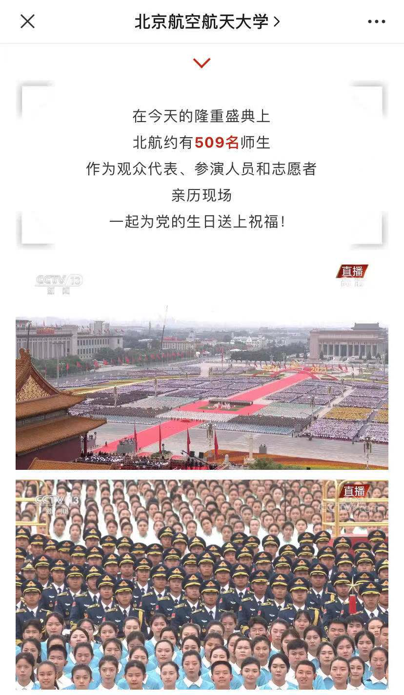 北京航空航天大學有500多名師生作為觀眾代表、參演人員和志愿者,親歷現場。其中,74名師生參加合唱,唱響最美的青春旋律。