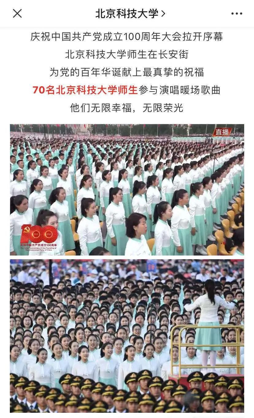 70名北京科技大學師生參與演唱暖場歌曲、26名師生參與集體致獻詞,以青春頌黨恩,獻禮百年盛贊!