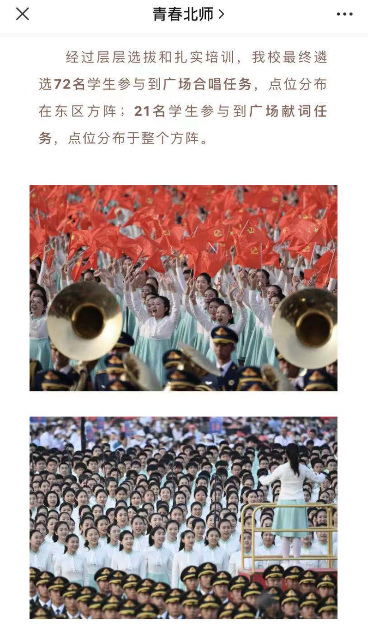 北京師范大學,共有266名師生全程參與。今年3月29日,北師大廣場合唱團、獻詞團就正式集結完畢,人均訓練時長近200小時。