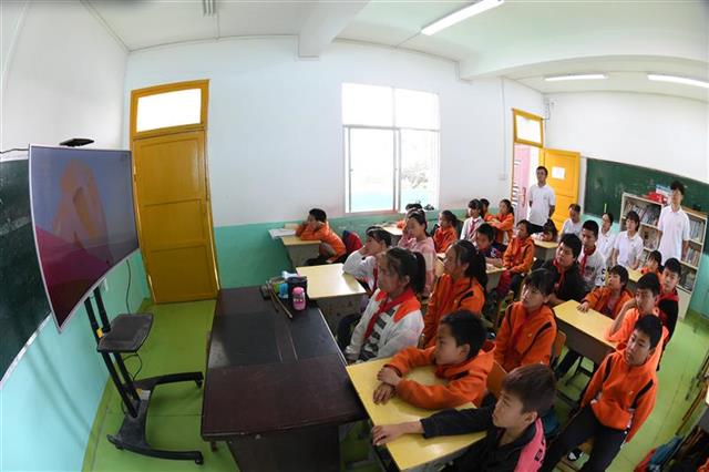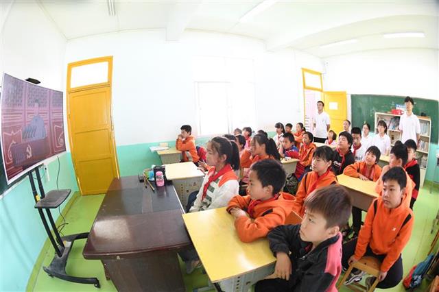 7月1日,貴州百里杜鵑管理區大水鄉大石村華農大石希望小學的孩子們,在華中農業大學研究生支教團老師的組織下,觀看慶祝中國共產黨成立100周年大會電視直播。(湖北日報全媒記者田悅 攝)