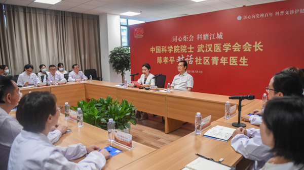 7月1日下午1時,中國科學院院士、武漢醫學會會長陳孝平院士來到青山區新溝橋街社區衛生服務中心,與青年醫生進行對話。