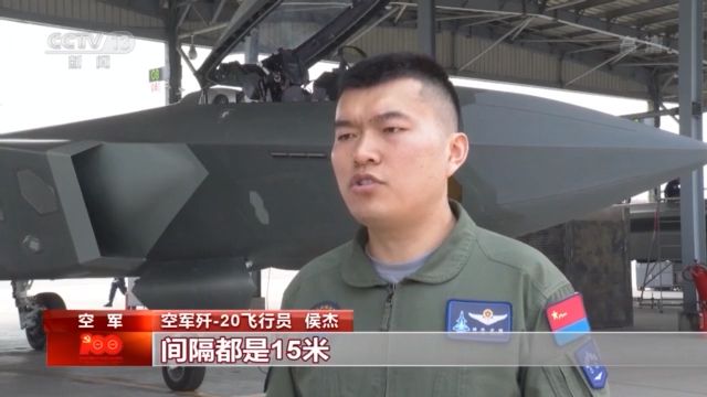 空軍殲-20飛行員 侯杰:所有殲-20飛機之間的距離都是20米,間隔都是15米。然后中隊與中隊之間,他們間隔時間是8秒鐘,間隔距離是1公里。