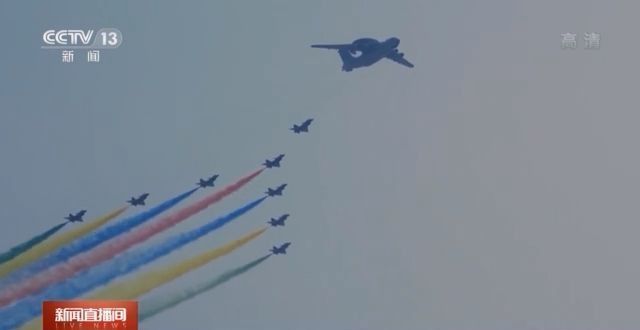畫面中,隨著彩煙梯隊的10架教-8型教練機以嚴(yán)整的隊形飛過,天安門上空留下了一條以紅、黃、藍(lán)為主的彩色煙帶。