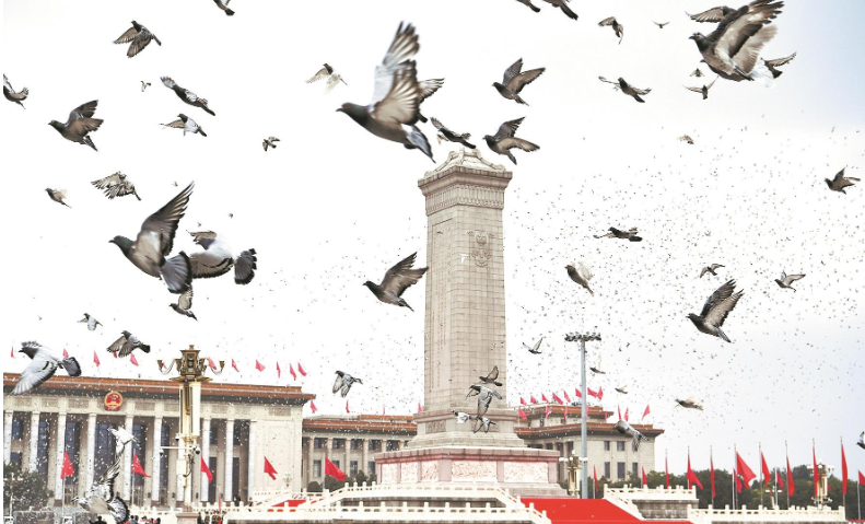 黃:鴿子會飛回家,它們靠太陽來辨別方位,也有少數可能會迷路。新中國成立70周年大慶那次放飛,因為晴天有太陽,它們很容易辨別回家的方向。今天是陰天,鴿子們盤旋的時間長一些。