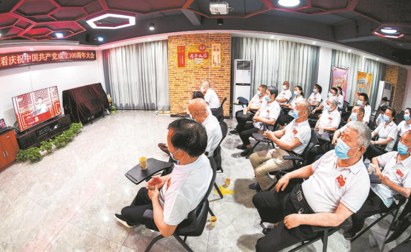 7月1日上午,武漢市青山區工人村街青和居社區黨員群眾服務中心內,傳出了陣陣掌聲和歡呼聲。極目新聞記者在現場與青和居黨員代表、居民、紅色物業工作人員一起觀看了直播。
