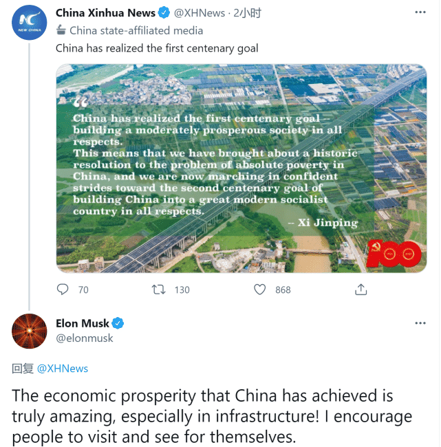 5、馬斯克鼓勵人們到中國看看 1日,新華社海外社交媒體帳號發(fā)布了中國實現(xiàn)了第一個百年奮斗目標(biāo)的消息,美太空探索技術(shù)公司創(chuàng)始人馬斯克則在這一消息下留言稱:“中國取得的經(jīng)濟(jì)繁榮確實令人驚嘆,尤其是在基礎(chǔ)設(shè)施方面!我鼓勵人們親自(前往中國去)參觀與見證。”此前馬斯克已多次對中國所取得的成就表示稱贊和祝賀。(中國青年報)