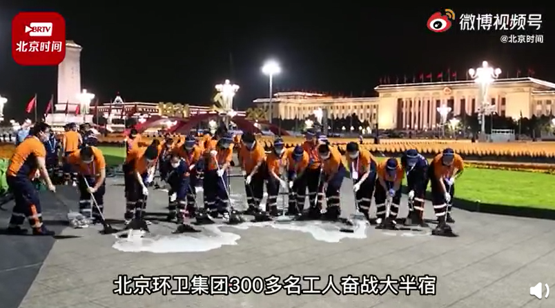 2、環(huán)衛(wèi)工人連夜清理紅毯積水 6月30日晚,北京迎來陣雨。北京環(huán)衛(wèi)集團(tuán)300多名工人連夜作業(yè),清理廣場及紅毯上的積水,確保7月1日上午三軍儀仗隊可順利通過紅毯。(@北京時間)