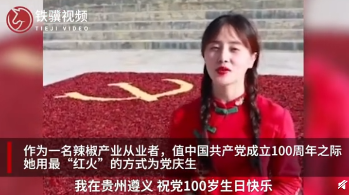4、遵義95后女孩用辣椒擺出黨旗 近日,貴州遵義95后返鄉(xiāng)女大學(xué)生鮮秀秀,用辣椒拼出巨型中國共產(chǎn)黨黨旗。據(jù)悉,鮮秀秀從小生長在遵義農(nóng)村,深受紅色文化的哺育,作為一名辣椒產(chǎn)業(yè)從業(yè)者,值中國共產(chǎn)黨成立100周年之際,她用最“紅火”的方式為黨慶生!(@荔枝新聞)