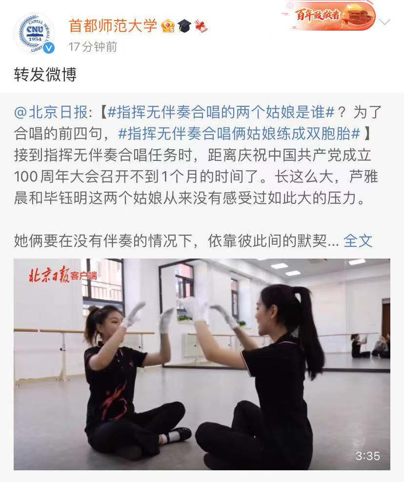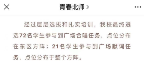 北京師范大學共有266名師生全程參與。今年3月29日,北師大廣場合唱團、獻詞團就正式集結完畢,人均訓練時長近200小時。