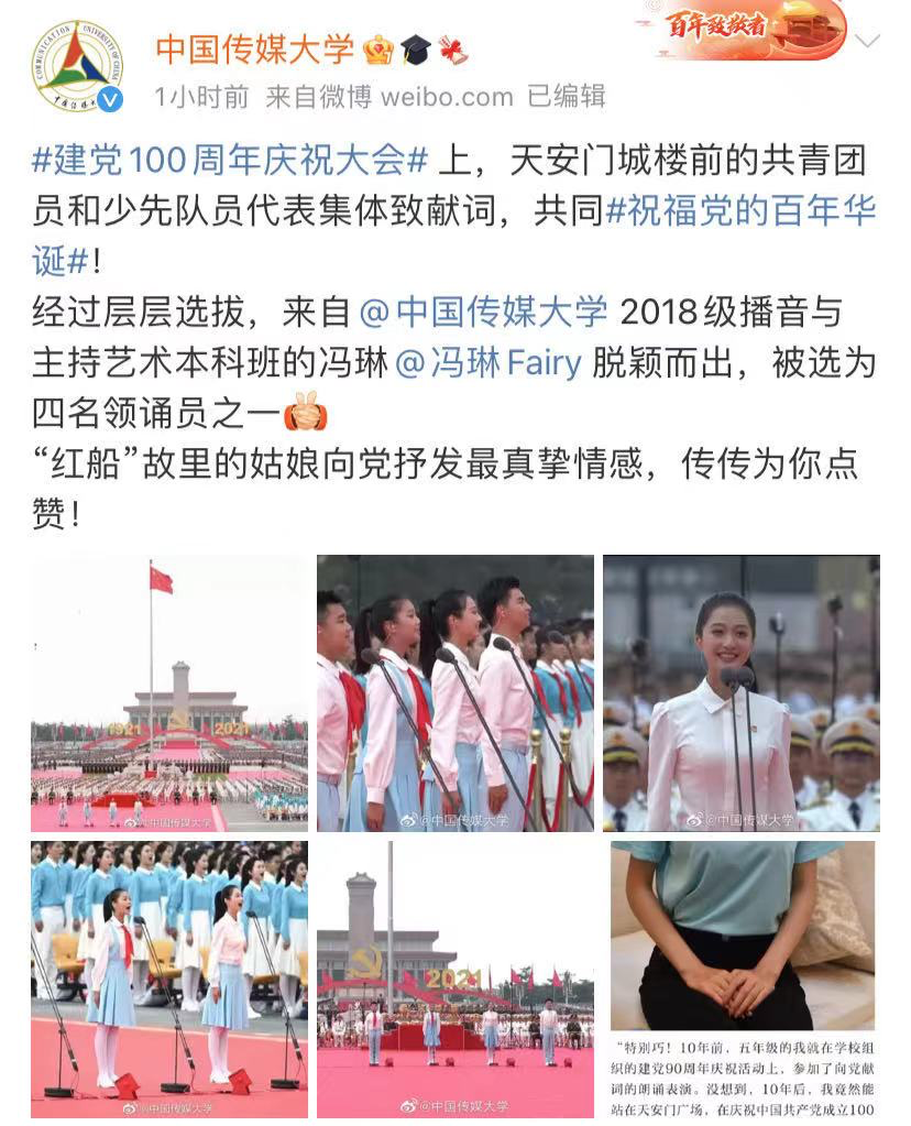 中國傳媒大學2018級播音與主持藝術本科班的馮琳,也被選為四名領誦員之一。