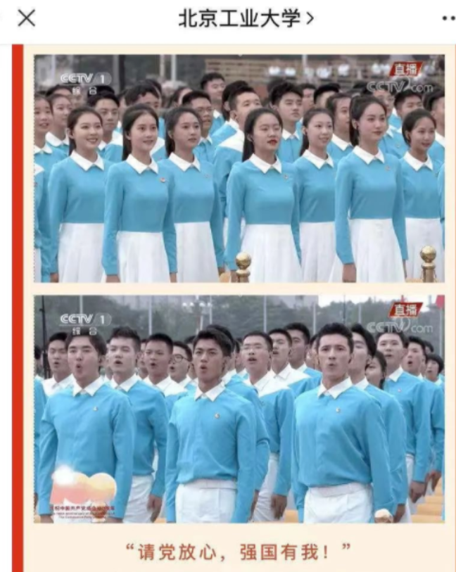 作為合唱團和獻詞團成員,百余名北京工業大學師生在天安門廣場,用高昂的歌聲與深情的獻詞,把最美的祝福送給黨!