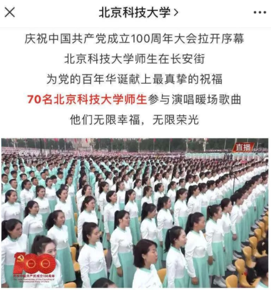 70名北京科技大學師生參與演唱暖場歌曲、26名師生參與集體致獻詞,以青春頌黨恩,獻禮百年盛典!