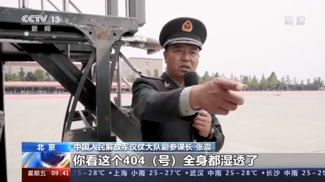 中國人民解放軍儀仗大隊 董世偉:對,我們刀鞘上是掛水壺,主要是為了在我們站立過程中,為了使這個刀鞘也是保持一條直線,我們三個人刀鞘角度保持一致,形成一個肌肉記憶,因為現在是負重訓練。能保持一致的話,等我們把這個水壺拿掉的時候,會更加整齊,就會更輕松一些。