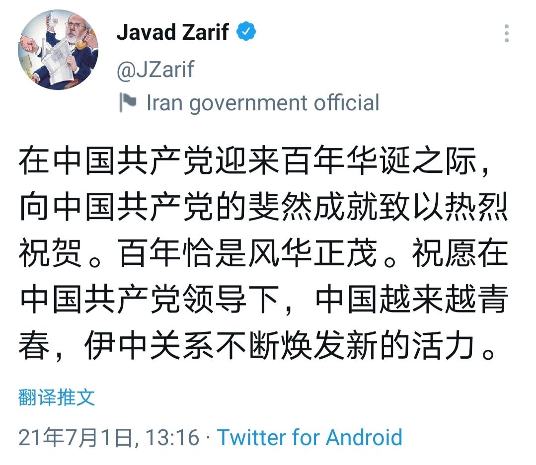 伊朗外長扎里夫祝賀中國共產黨百年華誕
