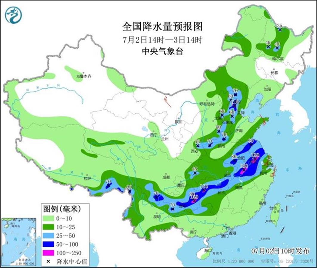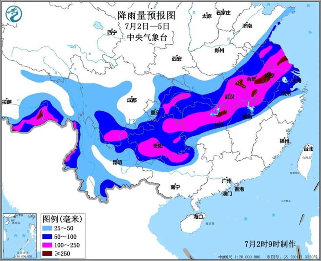 2日至5日,湖南北部、湖北東部、江西北部、安徽中南部、江蘇中部、河南東南部及貴州南部、廣西北部等地部分地區(qū)大暴雨,局地特大暴雨;上述地區(qū)最大小時(shí)降雨量有40-60毫米,局地超過(guò)70毫米,并伴有雷暴大風(fēng)等強(qiáng)對(duì)流天氣。上述地區(qū)累計(jì)降水量60-120毫米,長(zhǎng)江中下游沿江150-300毫米,局地超350毫米。