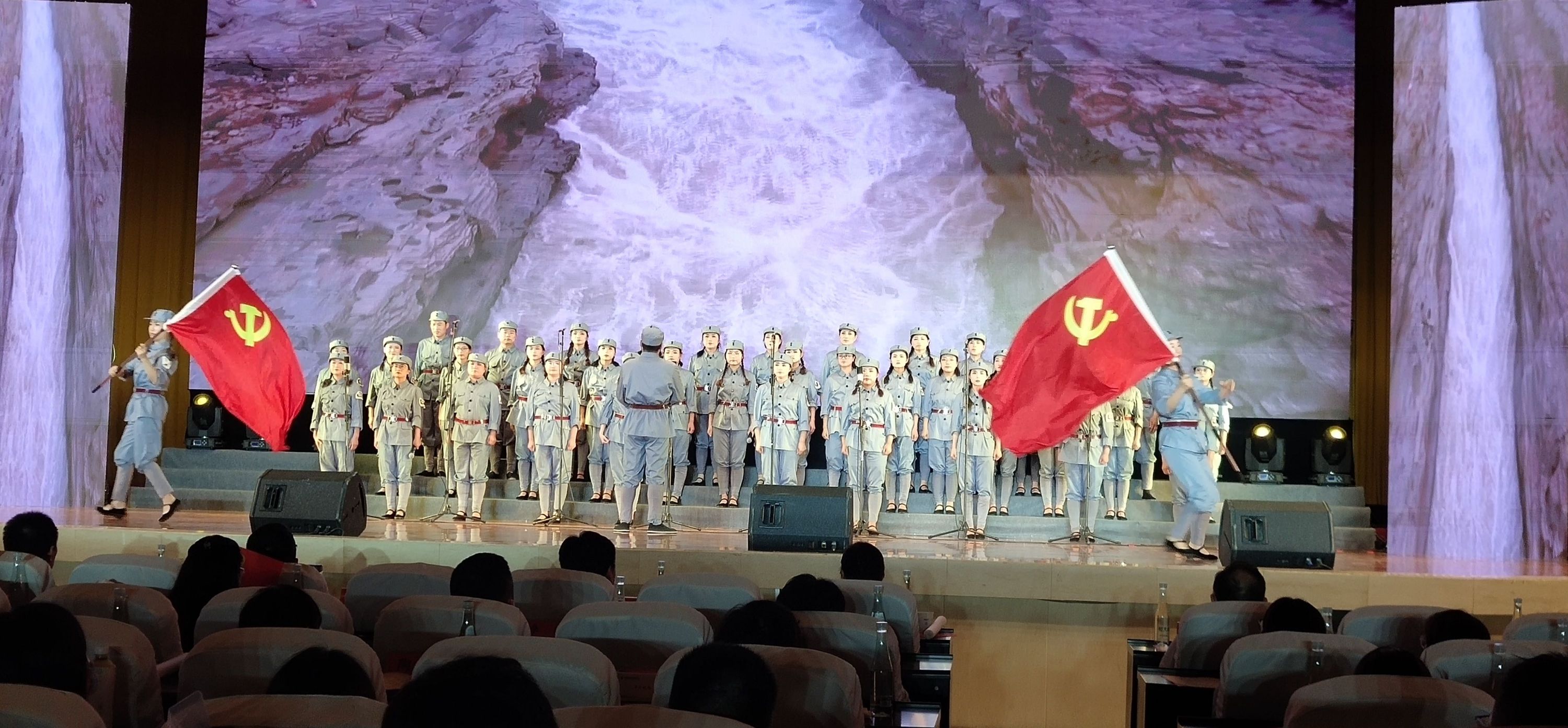 大會在全體起立齊唱《沒有共產黨就沒有新中國》的歌聲中拉開帷幕。整臺演出以大型情景史詩形式呈現,共分為“土地革命時期”“抗日戰爭時期”“解放戰爭時期”“建國初期”“一五時期—四五時期”“改革開放時期”“走進新時代”等七個篇章20首贊歌曲目。13支合唱隊伍,綜合運用合唱、表演唱、詩朗誦等多種藝術手段,生動展現中國共產黨百年來帶領中國人民進行革命、建設、改革的壯美畫卷,熱情謳歌黨的十八大以來,在以習近平同志為核心的黨中央堅強領導下,中國特色社會主義進入新時代,昂首闊步邁向全面建設社會主義現代化國家的新征程。