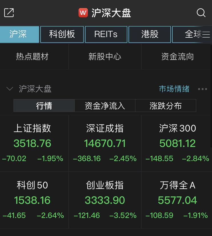 截至收盤,滬指報3518.76點,跌幅1.95%,成交額4522.63億元;深成指報14670.71點,跌幅2.45%,成交額5505.39億元;創業板指報3333.90點,跌幅3.52%。