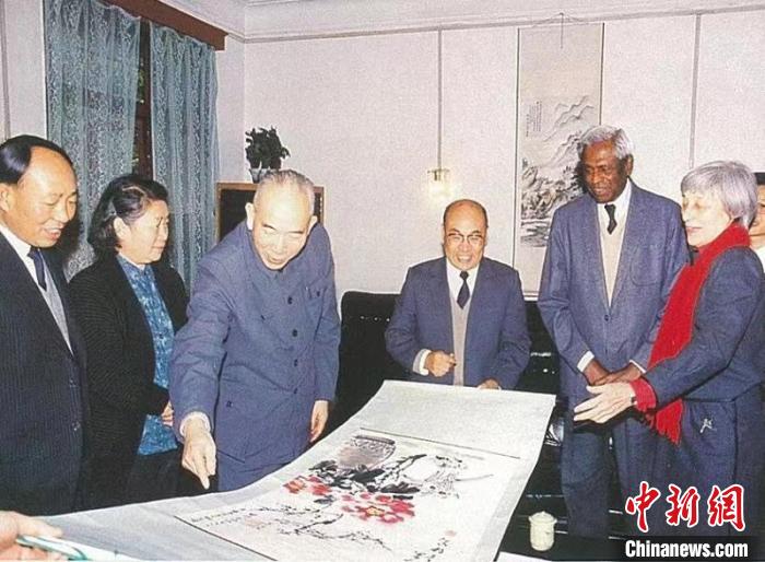 張廷翰(左一)在成都會見英籍華人韓素音、陸文星夫婦。四川省委統(tǒng)戰(zhàn)部供圖