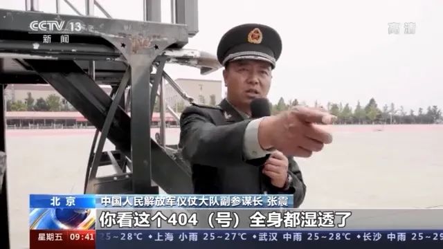 中國人民解放軍儀仗大隊副參謀長 張震:我看大家也是一身汗一身汗的。你看這個404(號)全身都濕透了,確實還是不錯的。應該講大部分同志,襯衣都已經濕透了,領帶都濕透了,但是你要對你的汗水負責任 你流那么多汗,最后說你不齊或者是說我們自己感覺不好,你對得起你的汗水嗎?對得起我們今天一上午的辛苦努力嗎?更多的不講了,馬上收操了,我希望我們這一趟走好。