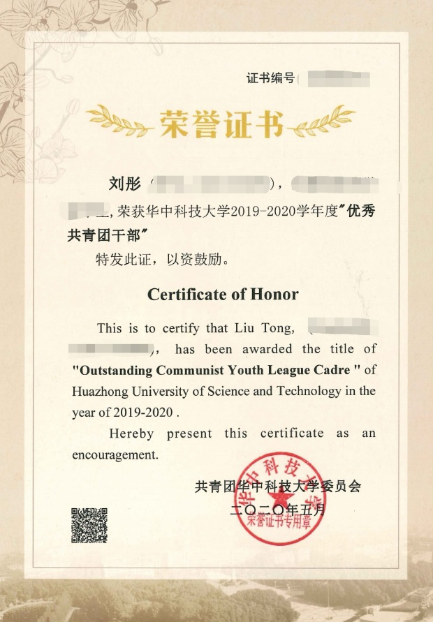 劉彤獲得2019-2020年度“優秀共青團 干部”獎狀。劉彤提供