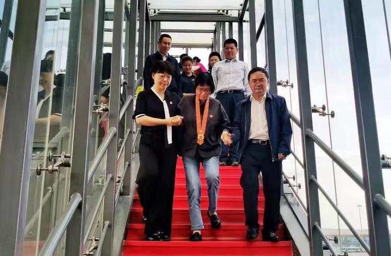 18時(shí)46分,飛機(jī)艙門緩緩打開,捧著鮮花的張桂梅出現(xiàn)在艙門口,胸前掛著“七一勛章”的她依然穿著那件熟悉的黑襯衫。一下飛機(jī),張桂梅感嘆:“今天終于回家了”。