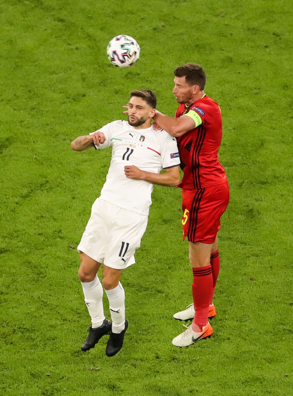 意大利隊球員貝拉爾迪(左)與比利時隊球員維爾通亨在比賽中爭頂。新華社記者 單宇琦 攝