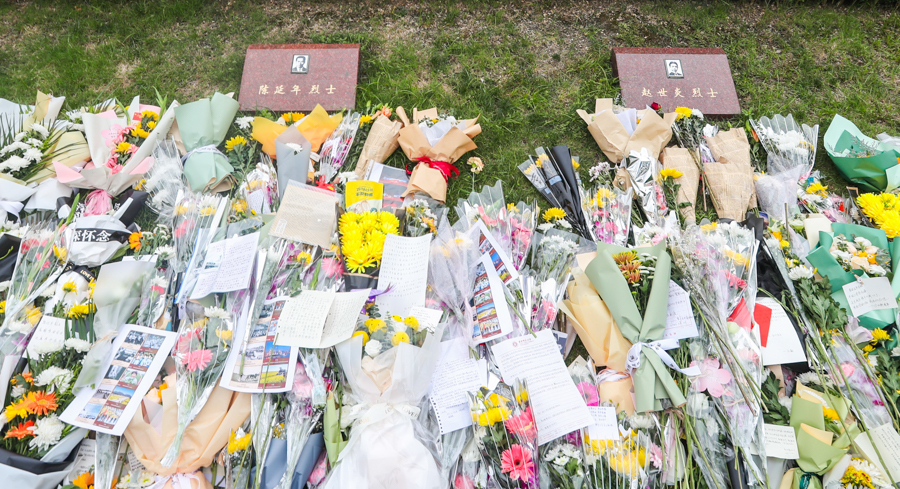 在陳延年、趙世炎烈士墓前,追思者敬獻的鮮花和留下的信紙鋪滿了草地。新華網吳愷 攝